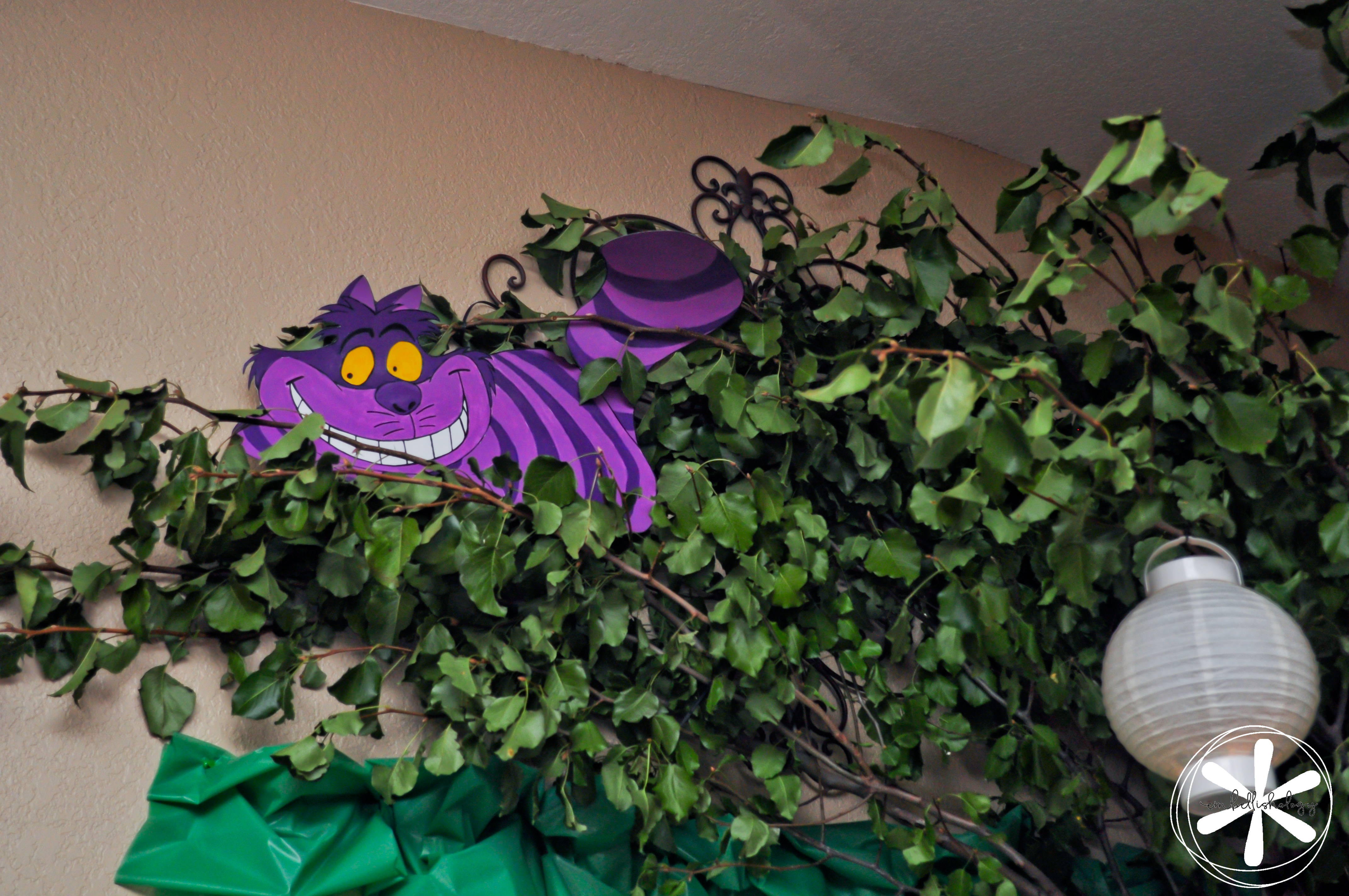The party guests had lots of fun discovering things hidden in the forest like the Cheshire cat peeking down from one of the trees.