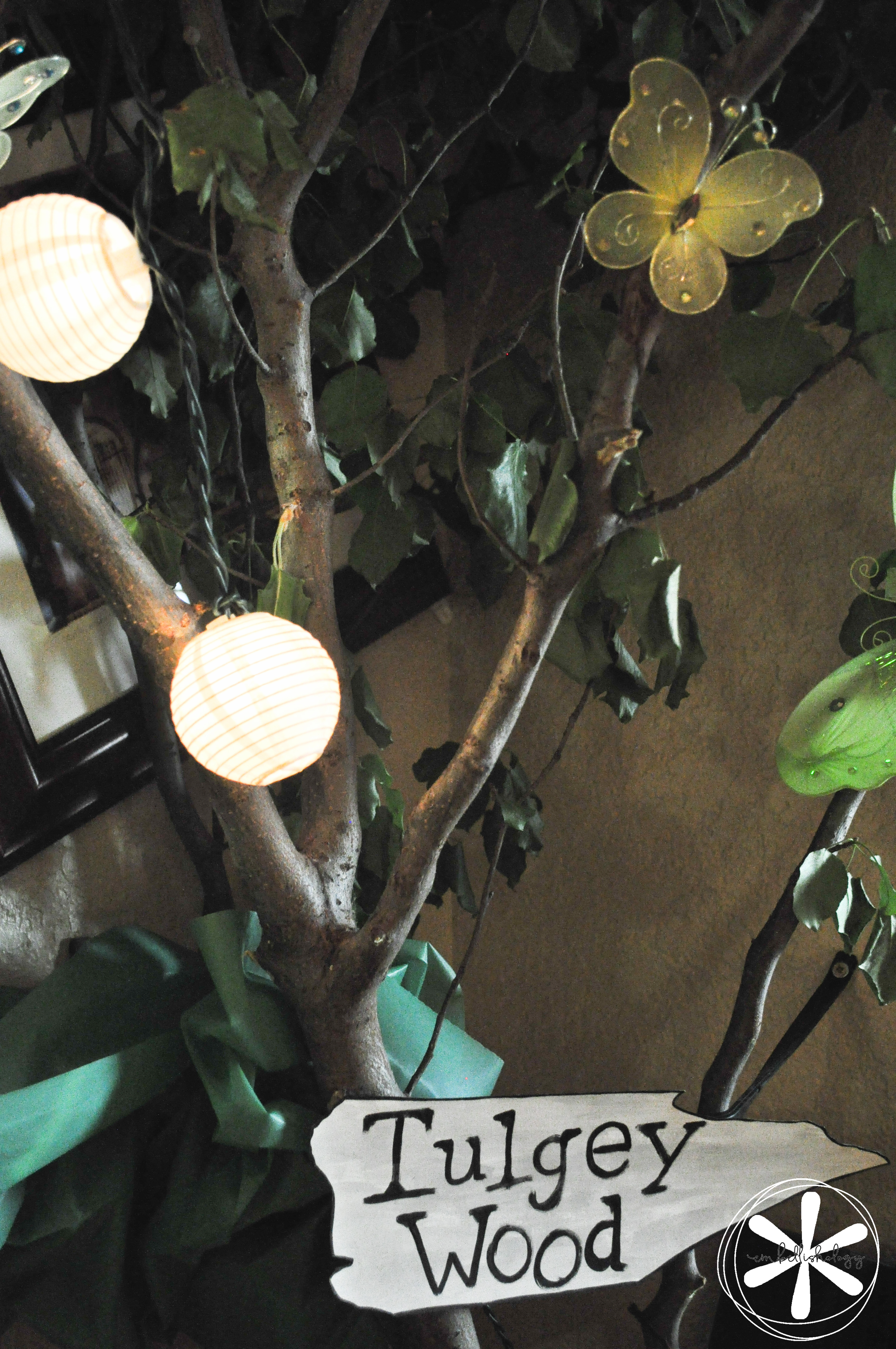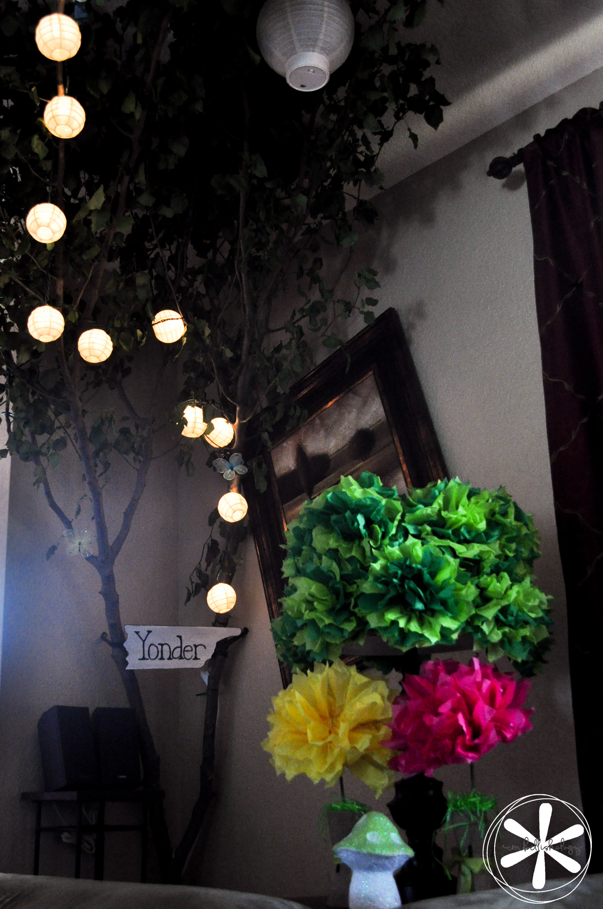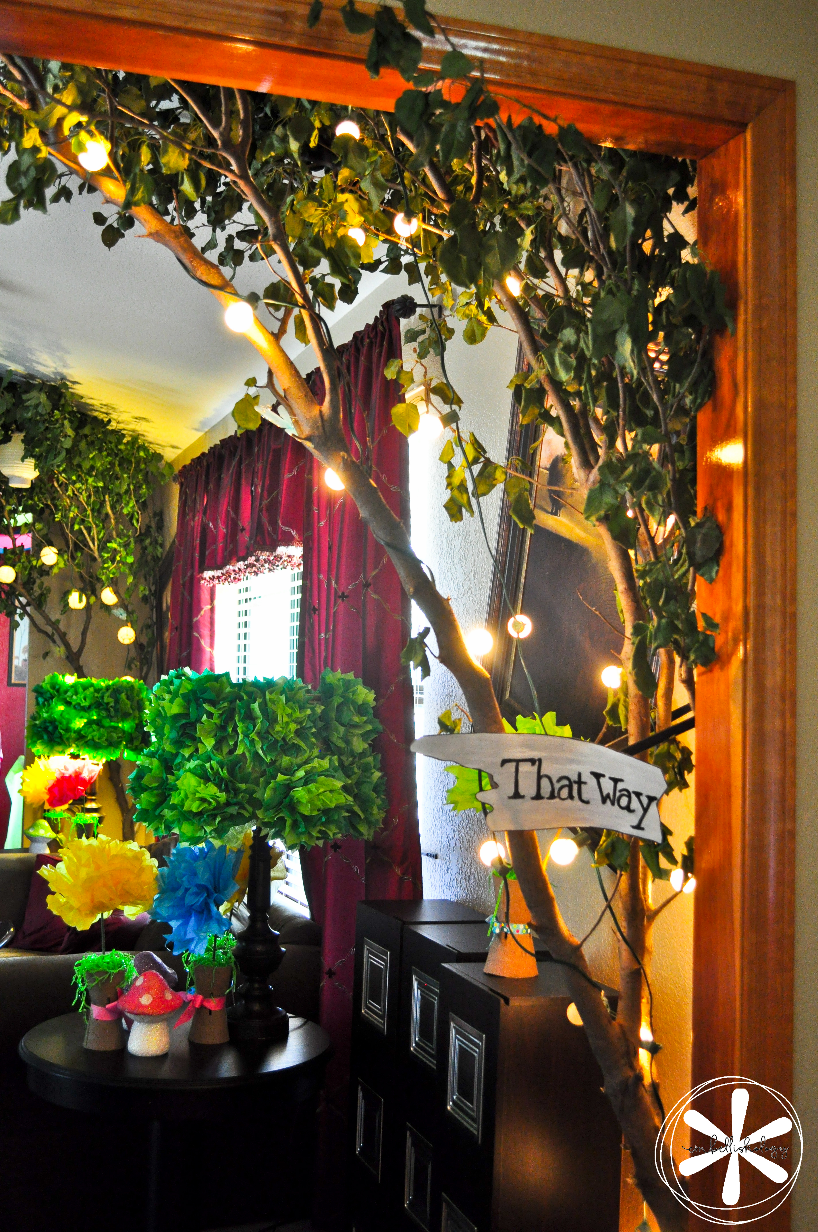 Once guests walked into the house they walked right into Tulgey Wood Forest. The forest started out with just lamps covered in green tissue pom poms, decorative mushrooms and tissue paper flowers. Then things exploded (that happens when you have 2 creative people living under one roof) and we ended up with live branches cut from trees on our property!