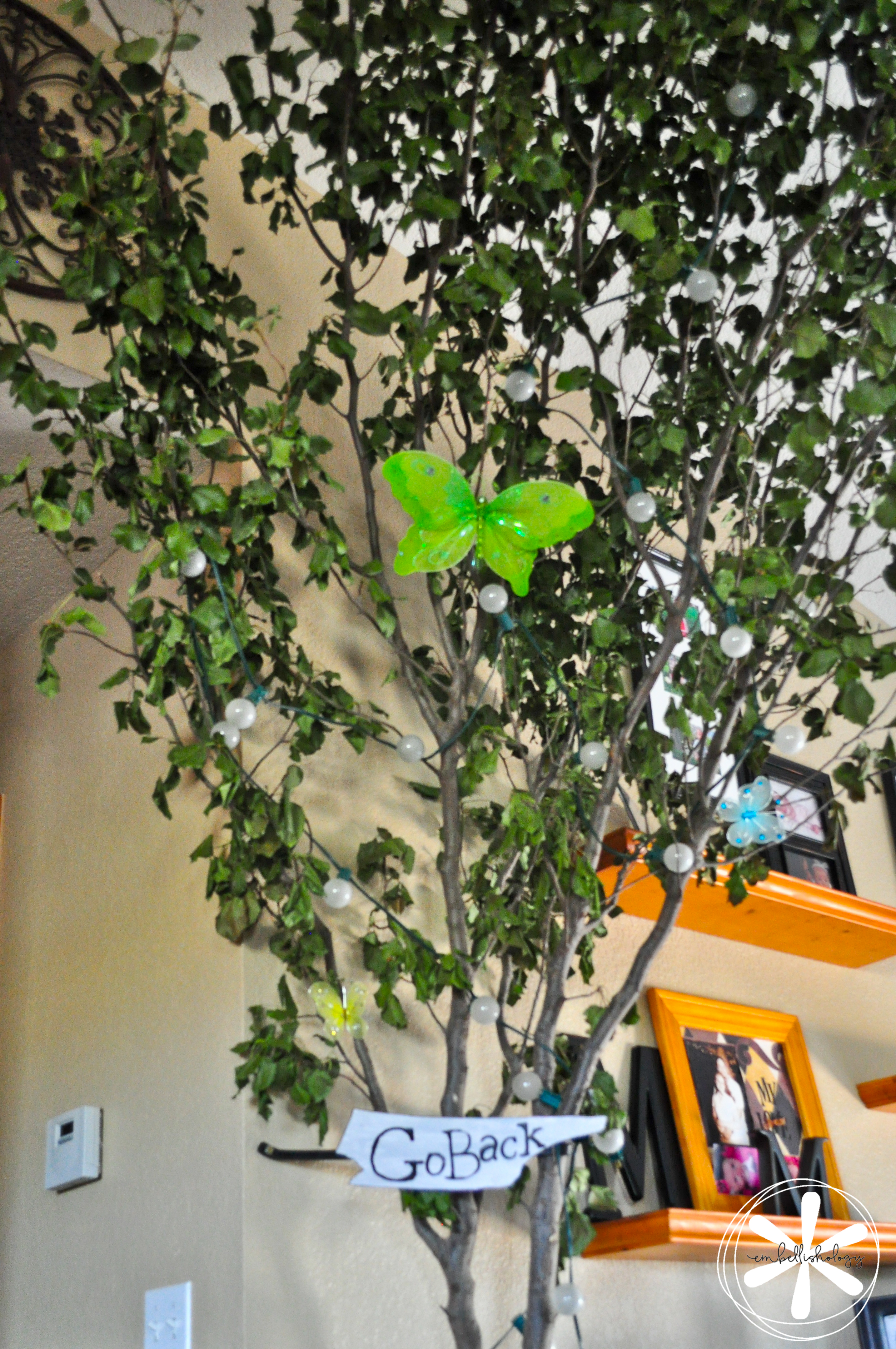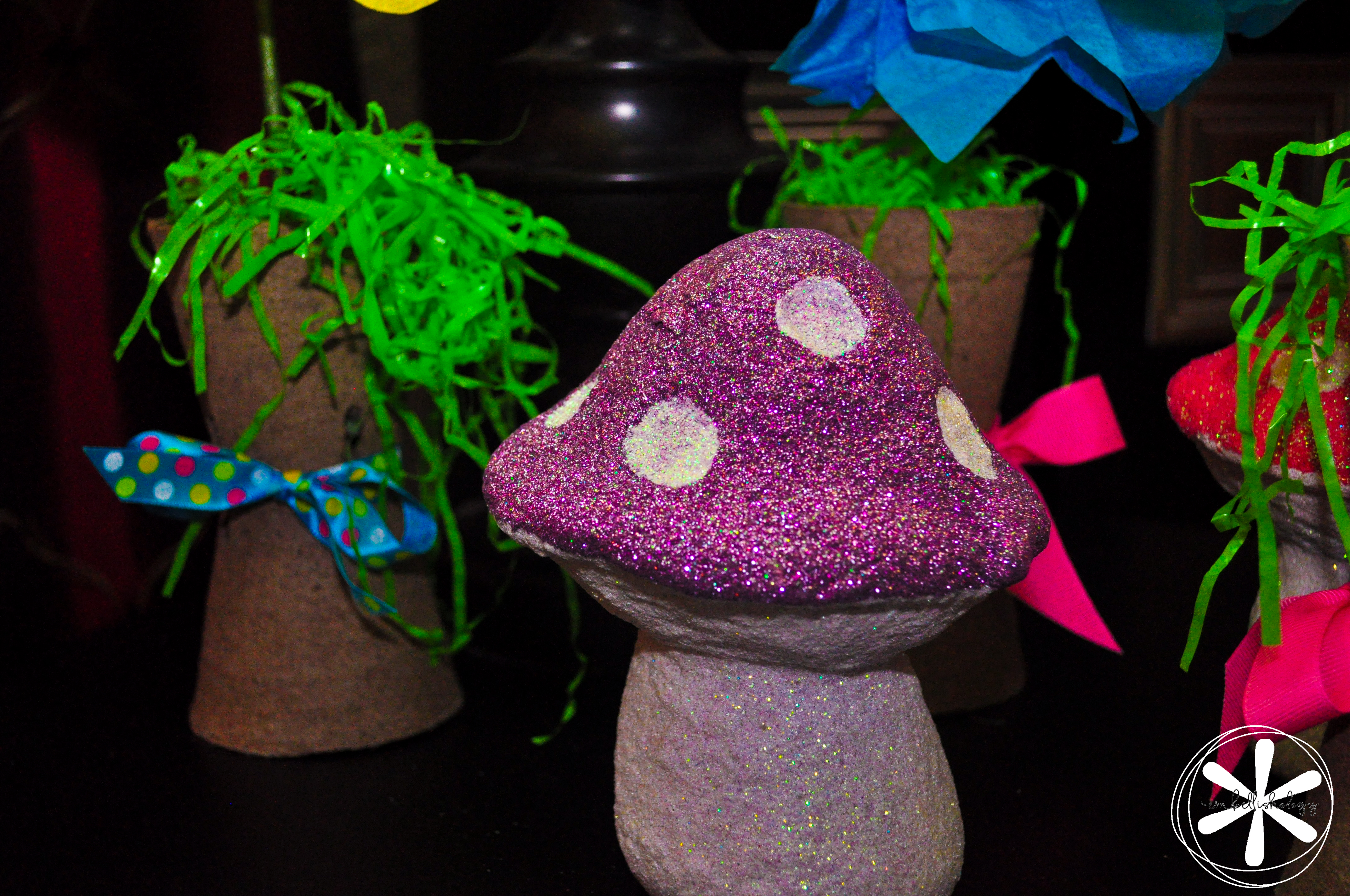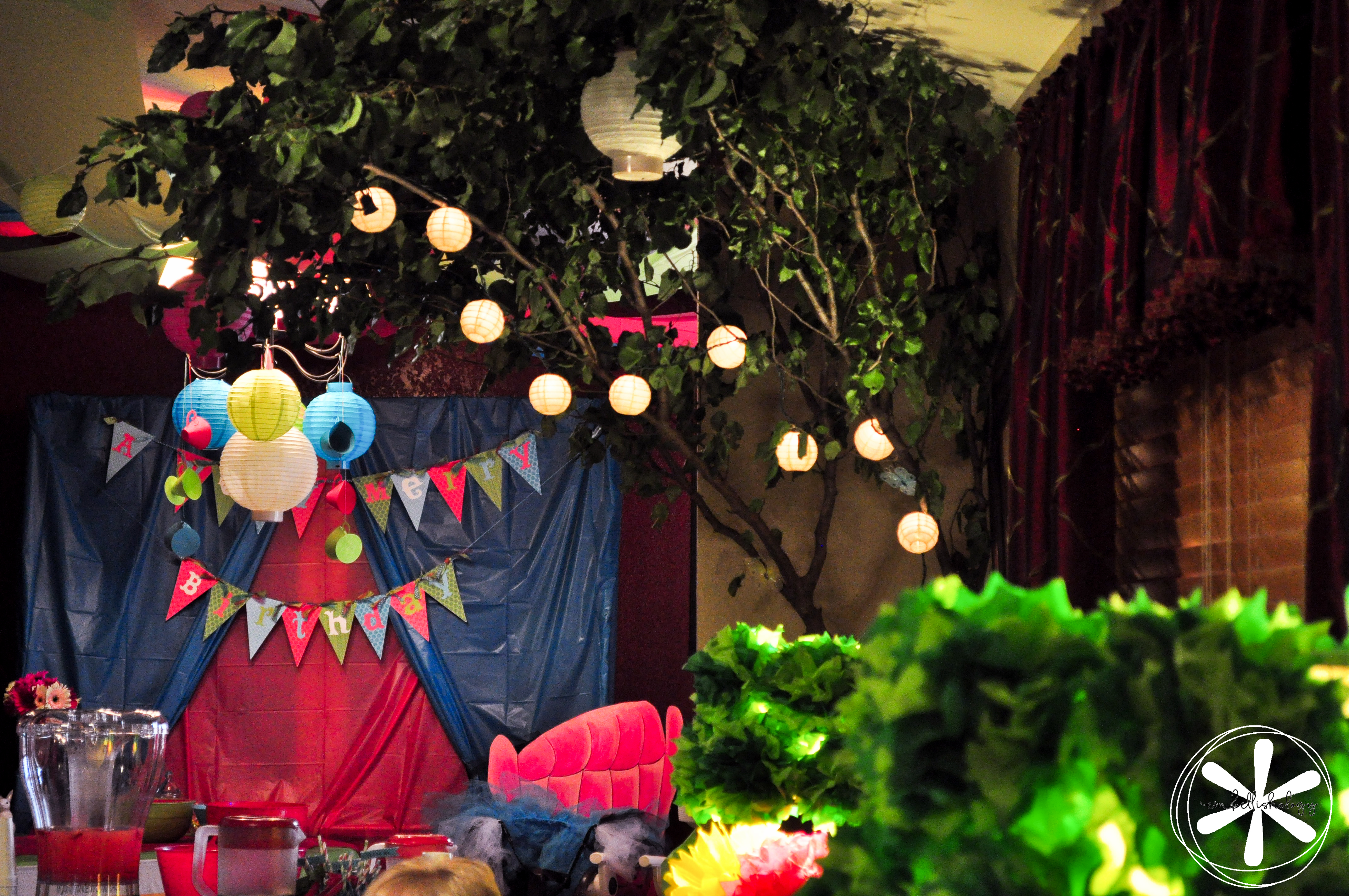 Once guests walked into the house they walked right into Tulgey Wood Forest. The forest started out with just lamps covered in green tissue pom poms, decorative mushrooms and tissue paper flowers. Then things exploded (that happens when you have 2 creative people living under one roof) and we ended up with live branches cut from trees on our property!